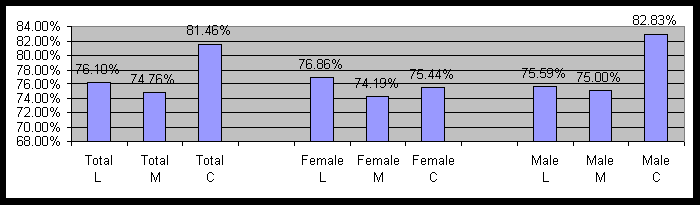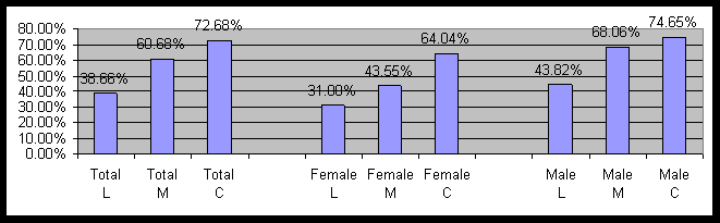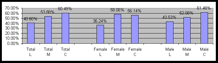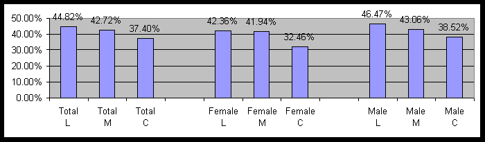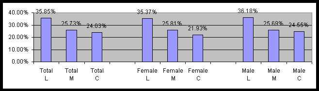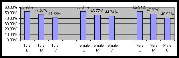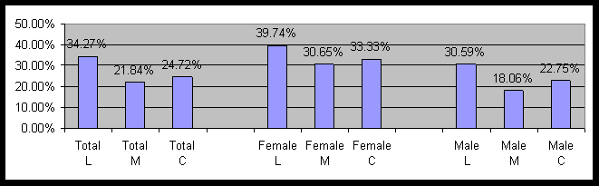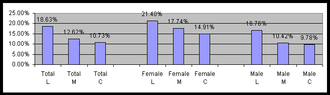 The survey consisted of 1,390 people, of which 615 were conservative, 569 were liberal, and 206 were moderate. Figure 1 contains the percent of those reporting chronic anxiety by political and gender cohorts. Note that L=Liberal, M=Moderate, and C=Conservative will be used on all graphs.
