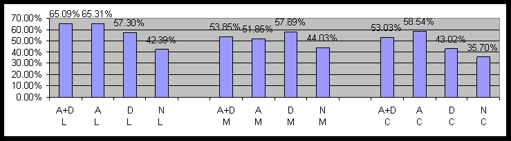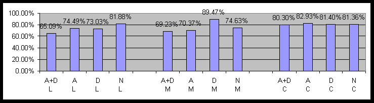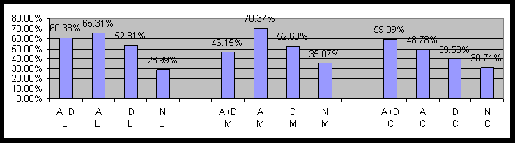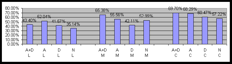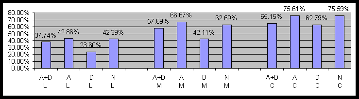 Figure 11: Impact of Anxiety and Depression on Language Comprehension by Political Cohorts (A+D=Anxiety+Depression, A=Anxiety only, D=Depression only, N=Normal)IV. Word Pair Test by Political and Gender Cohorts