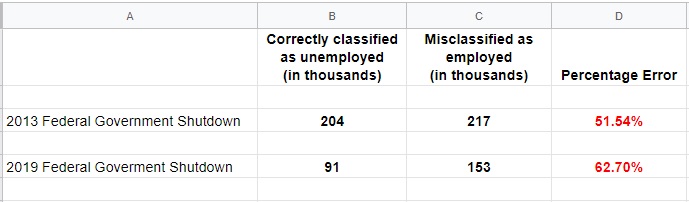 The Federal government shutdowns in 2013 and 2019 gave us two prior data points on this variety of misclassification problem. However, these were specific to Federal government employees. And the misclassification rate from the first time it happened, in October, 2013, was 52%.The next time a Federal shutdown happened, in January 2019, the BLS already had forewarning about the 2013 misclassification, and referenced it frequently in a supporting document. But they were apparently caught off guard in January 2019, as they make no reference on preparing for this situation. And their misclassification rate was 63%, 11% higher than the same issue that occurred under Obama.