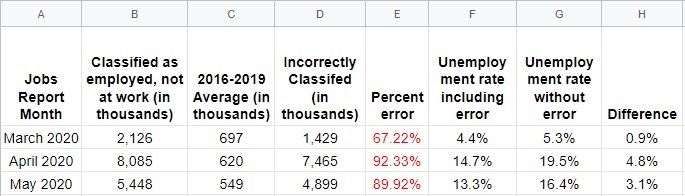 Beginning in March, the BLS noted a major problem with the misclassification of unemployed workers as employed. And these were not just small isolated errors from a few lowly census workers. These errors caused millions of people to be categorized as “employed”, when they were really “unemployed.”