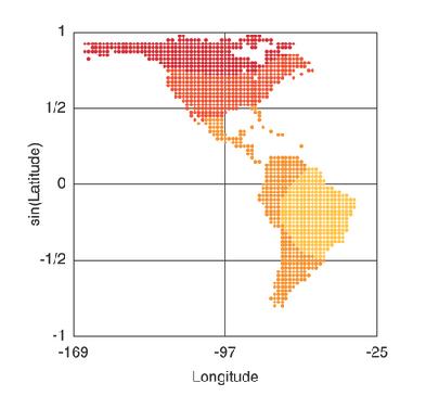 Heterozygosity and geographic distance from Africa. This image depicts the computed heterozygosity of Native American populations (from Wang, 2007). The darker the color, the higher the rate of heterozygosity in the population. The further north the population, the greater the rate of heterozygosity, indicating that migration reduces heterozygosity in the migrating population due to the founders effect, that is, smaller migrating subpopulations limit the genetic variation in new territories. This raises an interesting question: does north-south genetic variation in a species typically exceed east-west genetic variation?