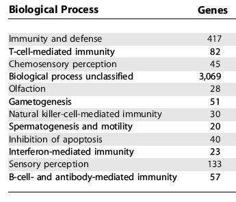 Human genes under selective pressure. This graph depicts the human genes under selective pressure (Nielsen, 2005). Note the large number of genes associated with immune system function, tumor suppression, apoptosis, spermatogenesis, and sensory perception. Interestingly, genes with maximal expression in the brain show little change when compared to chimpanzees. Genes associated with the X-chromosome have also been under selective pressure.