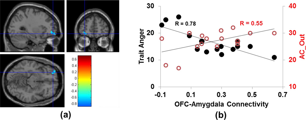 Trait Anger and Anger suppression by the Left orbitofrontal cortex and Right amygdala (solid dots=trait anger correlation, circles=trait anger suppression correlation (AC_Out scale))