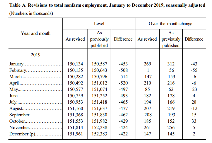 Table A: The BLS quietly wrote off 514,000 jobs in 2019 due to over counting, and the media did not say a word.