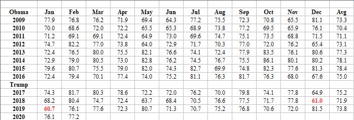 Now we included the percentages, by month, for the entirety of the Obama and Trump administrations. And as one can see, the lowest 2 months in the 134 months listed on the above spreadsheet are 60.7%, in January 2019, and 61.0%, in December 2018. The same two months we are accusing the BLS of manipulating.